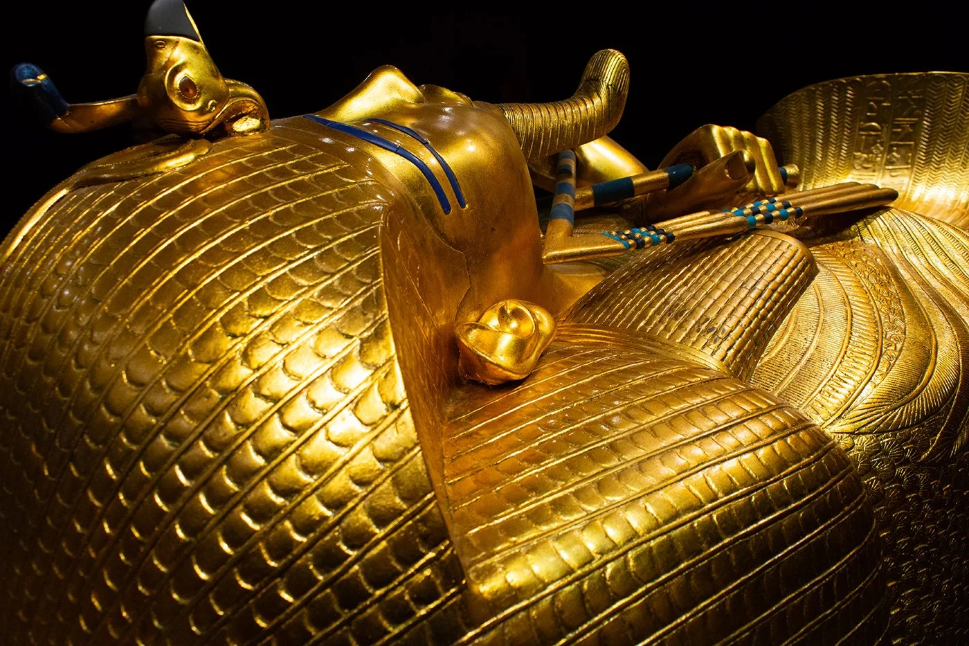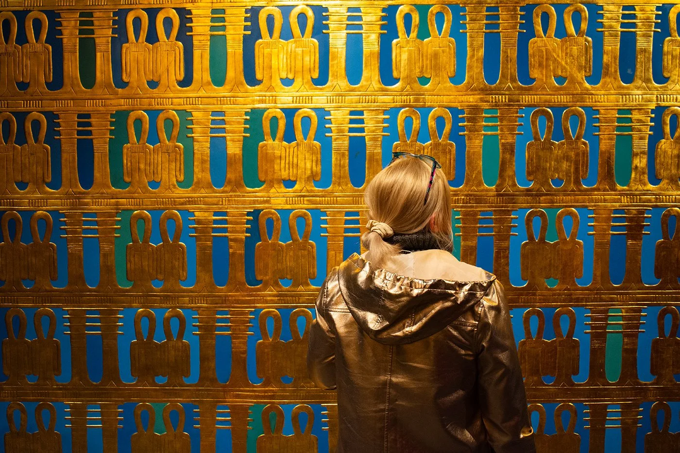 Was hier glänzt, ist tatsächlich 24-karätiges Gold – zumindest an der Oberfläche. Die berühmte Totenmaske, die Schreine, die filigranen Schmuckstücke: Für Laien sind diese Repliken von den Originalen kaum zu unterscheiden. Gerade weil Professor El-Ezaby und sein Team sich nicht mit bloßer Annäherung begnügen, sondern Materialität, Struktur und handwerkliche Logik rekonstruieren, entsteht eine Glaubwürdigkeit, die man sofort spürt. Es ist kein dekorativer Nachbau, sondern eine kunsthistorisch fundierte Rekreation.